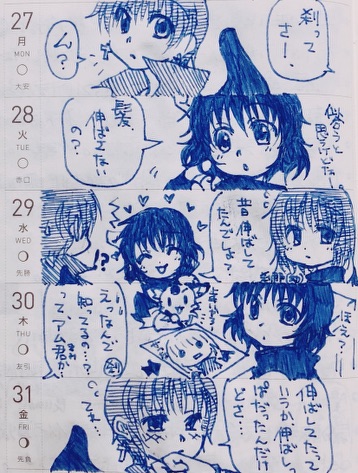 同じテーマで続き過ぎたので、切り替えに途中の週ではマスコットキャラにスポットを当てて7コマ描いてました。地味に楽しかったけど7コマに納めるの難しいって初めて思った。