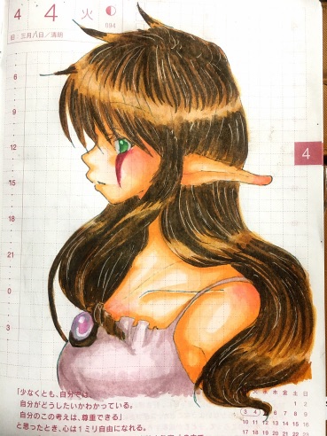 最初は兄妹セット(諱と霞)で描こうと思ったんですが、ただでさえデカデカ1ページに絵を描いてるから日記書くスペースちっちゃいのにもっと書けなくなるわヽ(`Д´)ノ!(笑)…と思って、今回は一人にしました(´ω`)