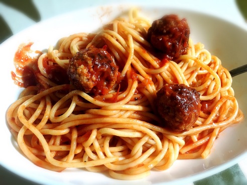 ミートボールスパに至っては昨日は普通にミートボールを上にちょこんと乗せて、その上からソースをかけるだけというシンプルさだったんですが、今日は余ってたスパゲッティをレンジでチン!するよりは一緒に火をかけた方が良さそうだなーと思って、ソースが入ってたフライパンに直接スパゲッティを投入→ちゃっちゃっと絡めた仕様にしてみました。