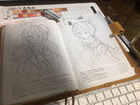 下書き書き終わって、ふぅ一休み。ちょっと気が散った後にまた作業に戻ってペン入れ、ふぅ一休み。消しゴムかけて、色塗り始めてもちょこちょこ気が散るのどうにかしたい(
