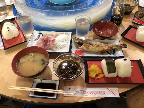 そうめん、マスの塩焼き、鯉こく、おにぎり2個、鯉のあらい…文句なしに全部美味い。