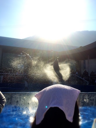 後方ながら水しぶきがギリギリ飛んでくる位置でスマホ守りながら撮ってたのと、逆光で眩しい中何が撮れてるか解らない状態(笑)でひたすらシャッターを切っていましたが、一応撮りたかったローリングジャンプ撮れてました!わかるかな?