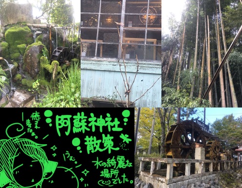 まずは3連水車がお出迎え。そのまま中へ入って行くと阿蘇神社があるのですが、現在は去年の地震の所為で崩壊してしまった故に工事中の様子が目に入ってきました。