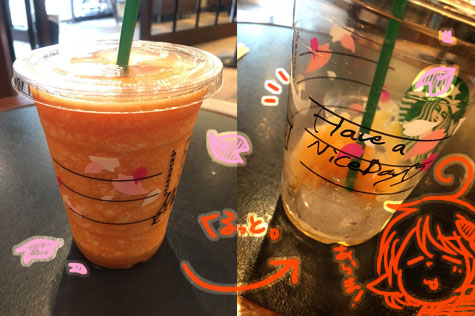 カップの桜デザインが可愛いなぁと眺めつつ「これからどうするかなぁ」とぽけーっとしながら飲んでいて、ふと飲み干しかけたカップをもう一度目をやると何か書かれてる事にそこでやっと気付く私。(遅