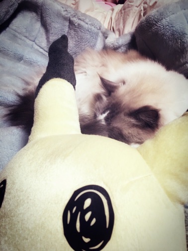 丁度毛布にミミッキュ立てかけてたら、丁度良くその先でアムが( ˘ω˘ )スヤァしてました。