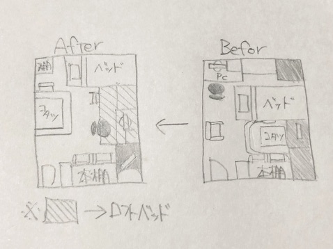 Before(あ、語尾のe忘れてる…)は神奈川から福岡に帰って来た時、一人暮らししてる間に兄の部屋がほぼ倉庫みたいになってて父の会社の備品が詰め込まれてる状態のまま私の部屋として無理やり改造してたので、かなり狭いスペースで「PCが出来て、眠れればいいや」的な配置でした。