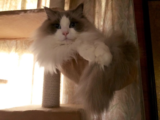 昨日のおはアム。キャットタワーで手を揃えてハンモックに入るのがマイブーム。