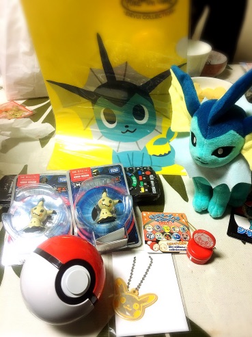 +予算に余裕が出来たので大好きなシャワーズグッズを2つ(クリアファイルとぬいぐるみ)、レプリカとして手元にあってもいいなと思ったモンスターボール(※中身はランダムでスタンプ1個とキャンディーが6粒。スタンプはイワンコでした)を追加購入。