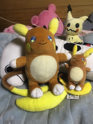 今日は店長が朝からすごく体調悪そうで裏で休んでもらってたので、途中同僚さんに休憩回しで助けを求めようかと思ったけどそうするとシフトがおかしくなりそうだったので却下→どうにか時間まで回す事は出来たけど、逆に私自身気疲れしたので(普段勤務で疲れたーってならないんですけどね…)元気になろうと思って帰り遅かったけど寄り道決行→自分用と友人への心付け土産のお買い物からの冒頭のアローラライチュウGET奮闘記(?)という流れ…になったという訳です。