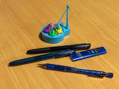 フリフリすると芯が出るタイプのシャーペンで0.5を、あと最近Twitterのタイムラインでみたオススメペンがお試ししやすい価格だったので2色買ってきました。