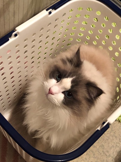 夜出勤が終わってご飯を食べていたら、「アムを風呂場から出してー」というヘルプ要請(?)が掛かったので向かってみたらこれですよ。その籠入るの購入した日以来じゃね?(笑