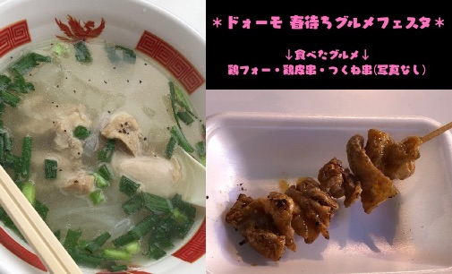 順番的にはつくね串(とりあえず最初に食べたかった。撮ろうとも思ったけど、味確認優先に。)→鶏フォー(今日は久々に冷え込んでて、ずっと外に居たら身体が冷えてきたので温まる為に購入。)→鶏皮串(最後にもう1つ何か食べときたいなーと思ってのチョイス)の流れ。