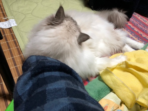 今日は冷えこんでたので、アムがずっと足の隙間で寝てました。