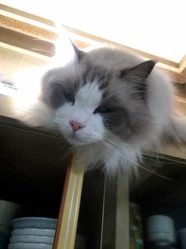 朝に陽だまりの中で食器棚の上で寝てたので出勤前に撮ったのがこれ。