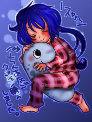 ちんあなごクッションを抱いて眠る絵は最初自分の自画像(※プロフにも載せてるあの犬キャラです)で描こうと思ったんですが如何せん絶望的に可愛くなかったので(笑)、急遽代理の蒼に抱いてもらいました。