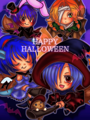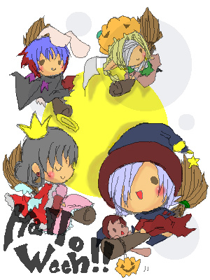 仮装はそれぞれ神恵が魔女、癒伽羅が狼(旧:お姫様)、杏逗がドラキュラ、カジュがミイラ…と見せかけて某音ゲーのパロで透明人間に扮しています。