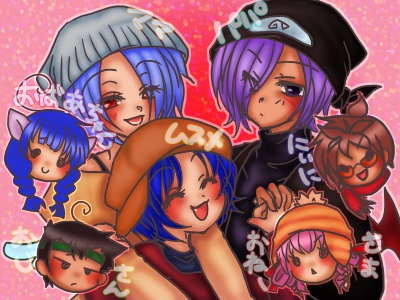 弓使い仲間の女の子と初代戦士・後々魔法使いの女の子→お姉さん、謡唄いの斬り賊さん→お兄さん、アム(飼い主私)・黒猫(飼い主謡唄いさん)→ペット