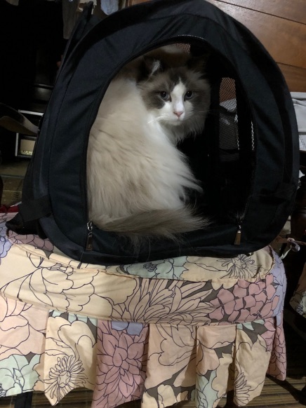 今日ふと目をやると、自らすっぽりキャリーに収まって暫くぼーっとしてました。