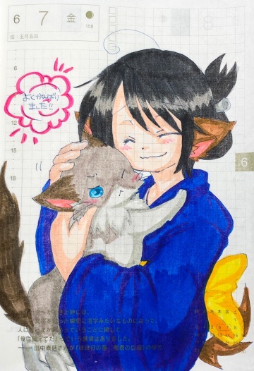 よく頑張ったね〜とナデナデしてる絵ですが、アムは抱っこが嫌いなので前足で飼い主の身体を突っぱねてるという…平常運転な様子を上手く描けたかと思います(笑