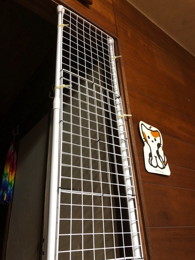 はめ込む予定のワイヤーフェンスの幅サイズに合わせてもう一本の突っ張り棒も縦にセッティングし、次はワイヤーフェンスを襖の高さ位に組み立てます。
