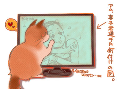 「ほら、次の人滑り出したよ!動きよるよ!」って指さして促そうにも、TVの方を向かない。