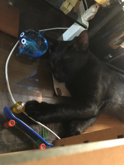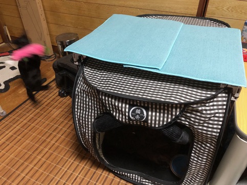 こうやって物に同化するんでたまに見失うんですけど、基本的には起きてる間はよく鳴いて付いてまわるので探しやすいといえば探しやすいです。踏みそうになるけど。