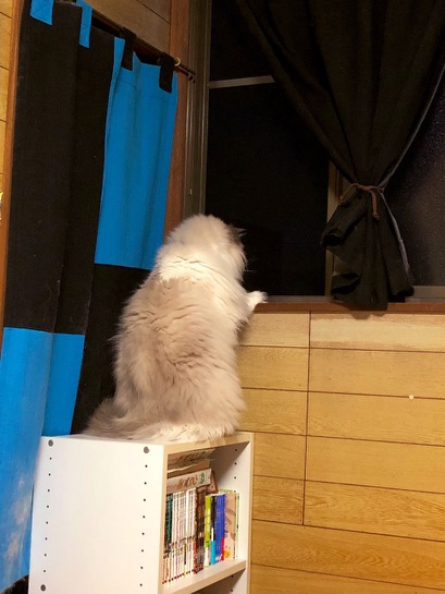 この日はまず窓枠(レール?)の部分に大きい図体をこれまたバランスよく納めて眺めていたかと思えば、ふと視線を外してまたそちらに目をやると棚の方に降りてお行儀良く眺めてて。