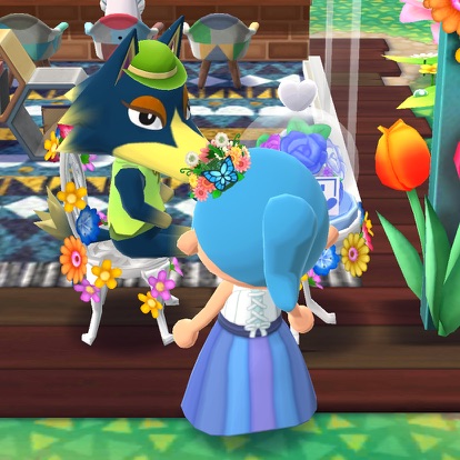 お花の冠、後ろを向いてよく見るとモルフォが。何これ可愛い。