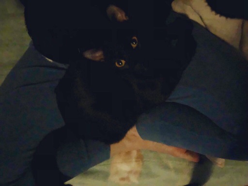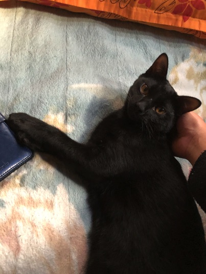 昨日2時間近くじゃらしで遊んだ後の、私のあぐらの上で寛ぐ琥珀。