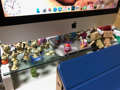 PC下のミミッキュたちの居場所も相変わらず。大分熱も冷めてきてから(まぁでも今でも普通にミミッキュ好きです。シャワーズと並ぶ位。)冷静に眺めるとコレ…ミミッキュ居過ぎだな(笑